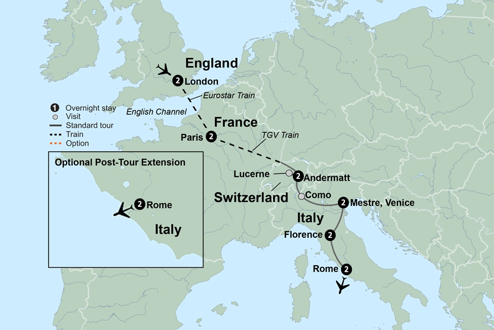 - Cross the majestic Swiss Alps into Italy.