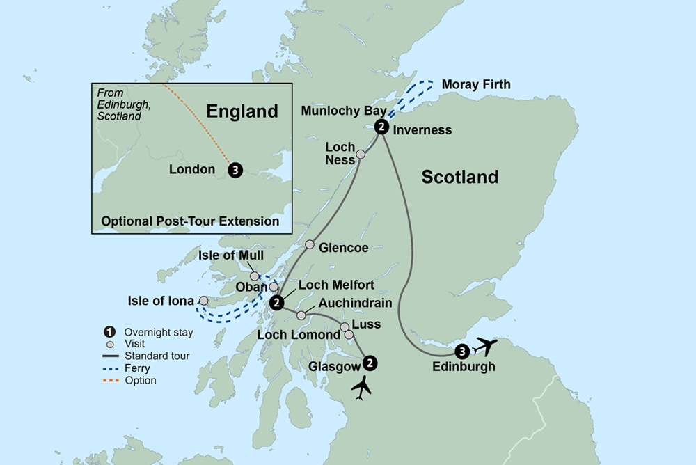 Discover the mystical side of Scotland, with its legends, whisky, clans, and historical towns. Explore the vibrant city of Glasgow. See a sheepdog demonstration at a family-owned farm. Enjoy the ocean views from a hotel in Loch Melfort. Taste the “water of life” at a local tasting experience. End the tour in the capital city of Edinburgh.