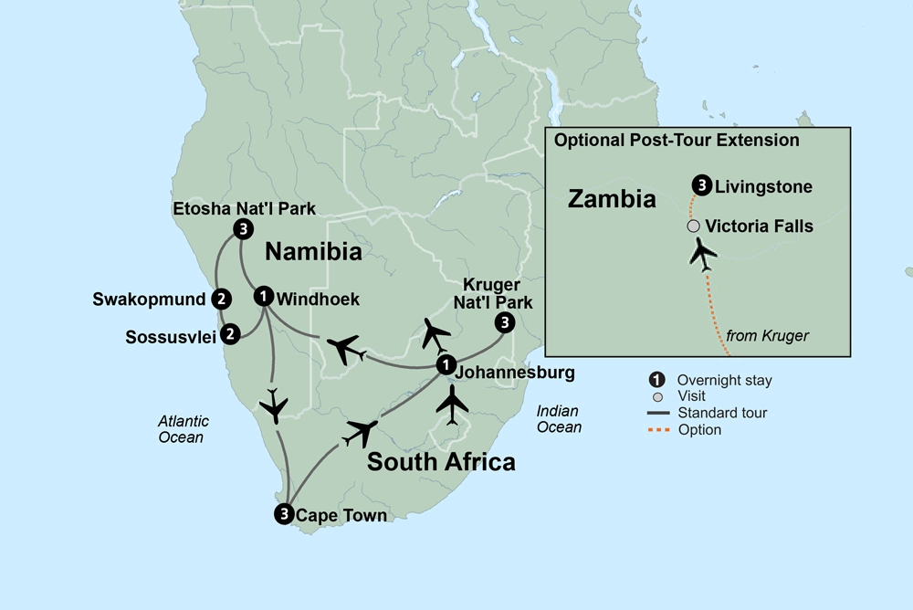 You’re on your way to South Africa and Namibia, two nations with intertwined histories and some of the most incredible landscapes, wildlife, and cultural diversity in the world. Get ready for a truly unique experience, from the dunes of Sossusvlei to the coasts of Cape Town.