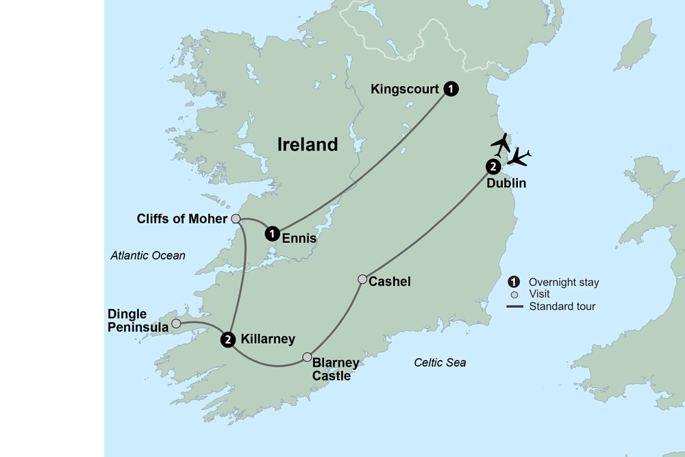 Depart Dublin for Ireland’s breathtaking countryside. Visit the town of Cashel for views of the historic Rock of Cashel, the location where it’s believed St. Patrick preached and converted the king of Munster. Next, journey to historic Blarney Castle, where you may take the opportunity to kiss the famous Blarney Stone. Legend has it that those who kiss the stone are bestowed with the gift of eloquence. End your day in Killarney, a town surrounded by natural beauty. Enjoy dinner this evening at a local restaurant.