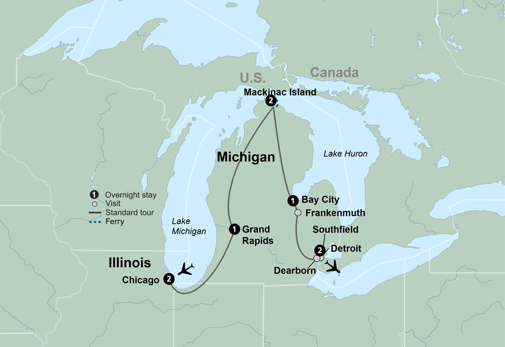 Get ready for a relaxing journey through the tranquil beauty of Mackinac Island and the Great Lakes region. This stunning landscape comes alive amid old-fashioned traditions. No activities are included today as flight arrival times will be scattered through the afternoon and evening.